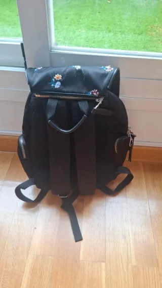 Mochila negra de la marca Parfois con un bonito estampado floral. - Diseño con solapa extraible - Bolsillo frontal con cremallera. - Detalle de flores bordadas. En perfecto estado!
