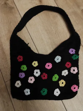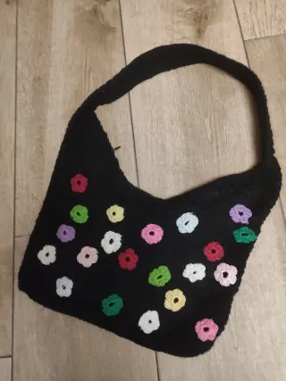 Bolso de ganchillo negro adornado con pequeñas flores de colores. - Diseño de ganchillo. - Adornos florales. - Asa para llevar al hombro. Bolso medidas 38x28 en muy buen estado