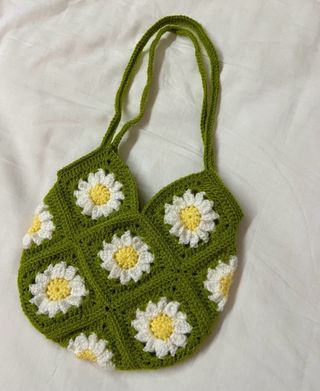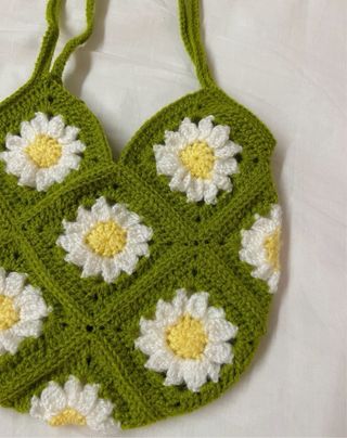 Bolso de mano tejido a crochet con un encantador diseño de flores de margarita. -Medidas 22x22cm - Motivos florales blancos y amarillos. - Base y asas en color verde. - Pieza única hecha a mano.