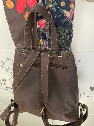 Mochila con un diseño único y original, combinando cuero marrón con aplicaciones de tela patchwork y detalles florales. - Cierre principal con solapa y botón. - Bolsillo frontal con cremallera. - Adornos de botones y apliques. - Correas ajustables. Regalo por compra de lote de ropa.