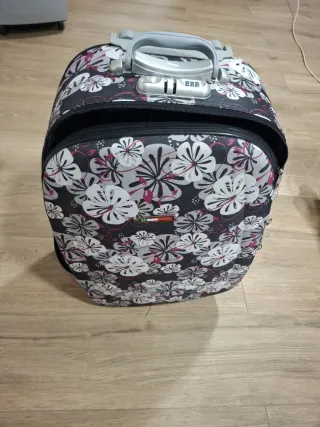 Maleta trolley con un diseño floral llamativo. Es práctica para llevar tus pertenencias. - Diseño con flores en blanco, rosa y negro. - Asa extensible para facilitar el transporte. - Candado de combinación integrado.