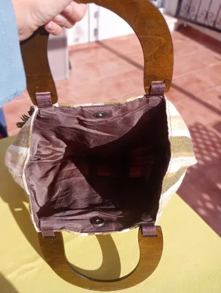Bolso de mano con un diseño de rayas verticales y un detalle de flor. - Asa de madera. - Cierre superior. - Adorno floral.