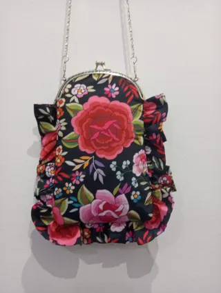 Bolso de boquilla con un bonito estampado floral, confeccionado con tela de mantón artesana. - Diseño con volantes. - Cadena metálica para colgar.