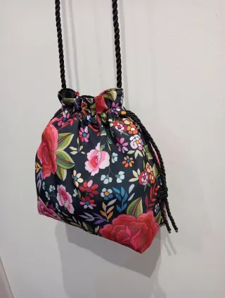 Bolso bombonera con un estampado floral vibrante, ideal para ferias y fiestas. - Cierre fruncido. - Asa de cordón trenzado. - Diseño llamativo con flores rojas, rosas y azules.