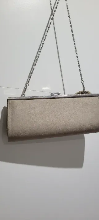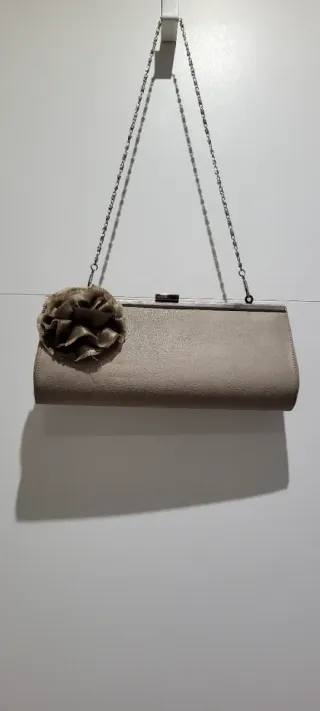 Elegante bolso de mano para eventos especiales. Su diseño combina un acabado en tono beige con detalles dorados y un delicado aplique de flor. - Cadena metálica plateada. - Cierre de broche.
