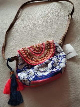 Precioso bolso bandolera nuevo, sin estrenar. Marca Brotes, El Corte Inglés. Ideal para darle un toque bohemio a tu look. - Diseño étnico con flores bordadas. - Detalle de flecos. - Asa bandolera regulable. Hago envíos por Wallapop