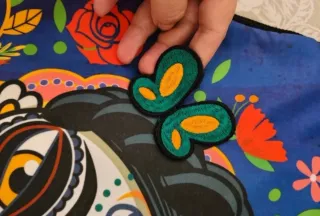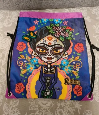 Mochila con un vibrante diseño inspirado en Frida Kahlo. Perfecta para llevar tus pertenencias con estilo. - Cierre de cordón. - Ribete superior y esquinas inferiores en color morado. - Estampado detallado con flores y mariposa.