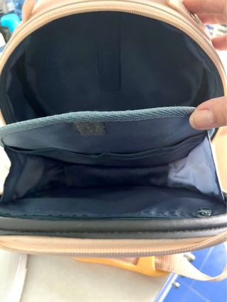 Neceser redondo con un diseño de flor en relieve. Es práctico para llevar tus esenciales. - Asa superior. - Correa de hombro ajustable con protector. - Cierre de cremallera. Se vende neceser rígido de color beige de forma redonda, con 2 apartados interiores, en un lado cremallera y en el otro compartimentos para productos de aseo. medidas 25 cm de ancho X 25 cm de alto 7€