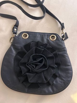 Bolso pequeño de polipiel con un diseño llamativo. - Adorno de flor grande en la parte frontal. - Correa ajustable para llevar al hombro o cruzado. - Cierre de cremallera.