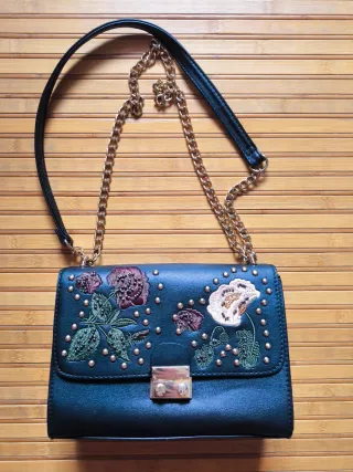 Bolso de la colección especial de Zara con un diseño llamativo. - Adornado con bordados de rosas rojas y detalles de insectos. - Tachuelas plateadas alrededor del frontal. - Cadena plateada para llevar al hombro o cruzado.