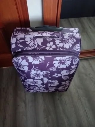 Maleta de viaje con un llamativo diseño floral. - con ruedas y asa extensible - Color base morado. - Estampado de flores blancas. - bolsillo interior - medidas: 65 cm alto x 45 cm ancho x 26 fondo