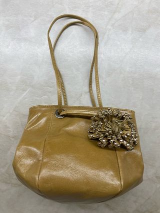 Elegante bolso de la firma francesa Charles Jourdan. - Color marrón dorado. - Adorno floral con detalles metálicos.