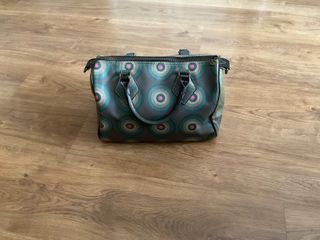 Bolso de mano Desigual con un llamativo estampado de círculos concéntricos en tonos verdes y rosas. - Diseño único y colorido. - Cierre de cremallera superior. - Asas de mano.