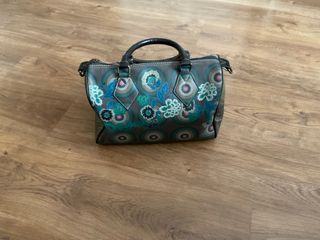 Bolso Desigual con un diseño llamativo y original. - Color negro con bordados florales multicolor. - Asa de mano. - Correa extraíble para llevar al hombro.