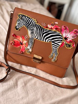 Bolso de mano con un diseño único y llamativo. - Adorno de cebra con detalles de flores y pedrería. - Color marrón principal con toques multicolor. - Cierre metálico dorado.