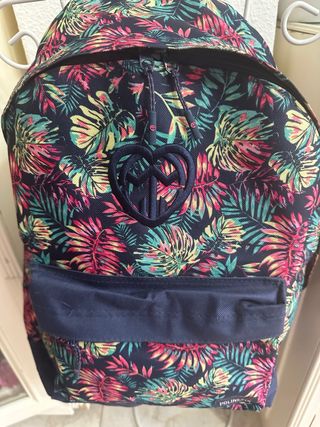 Mochila con un vibrante estampado tropical. - Diseño con hojas y flores en tonos vivos. - Bolsillo frontal con cremallera. - Logo de la marca bordado en forma de corazón.