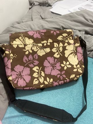 Bolso con estampado floral. Doble cierre de solapa. Correa ajustable.