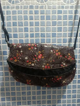 Bandolera pequeña acolchada en tejido efecto piel con estampado floral. Bolsillo interior y exterior con cremallera Solapa imantada y cierre de cremallera Un compartimento principal y un bolsillo con cremallera Dos asas de quita y pon: cadena para llevar al hombro y correa regulable para usar como bandolera. Material suave y acolchado. 21 x 6,5 x 13 cm Está nuevo aunque no conservo la etiqueta