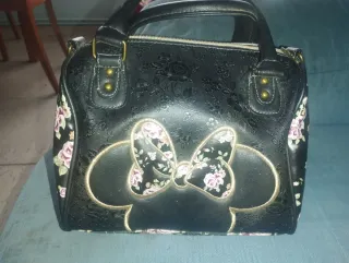 Bolso negro con un encantador diseño de Minnie Mouse y un estampado floral. - Detalle de Minnie con lazo floral. - Estampado floral en relieve por todo el bolso. - Asas superiores y detalles metálicos.