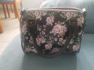 Este bolso estaba sin usar, unico deterioro las esquinas, ver fotos 2-5. Por esta razón el precio. Elegante bolso con estampado floral de rosas sobre fondo negro. - Diseño con asas superiores. - Incluye correa desmontable para llevar al hombro o cruzado. - Detalle de cadena dorada.