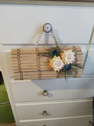 Elegante bolso de mano con un diseño único de bambú y adornos florales. - Material: Bambú - Adorno: Flores y plumas - Asa: Cuentas de madera