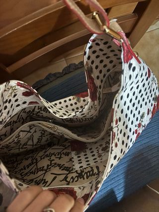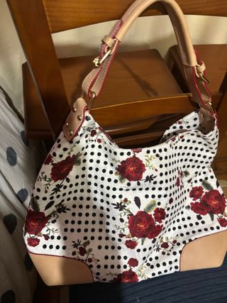 Bolso con un diseño llamativo de lunares y flores. - Base y detalles en piel sintética. - Cierre de cremallera. - Asa ajustable.