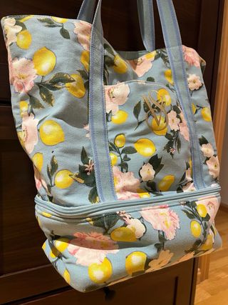 Bolso de playa o de uso diario con un alegre estampado floral y de limones. - Diseño con cremallera en la parte inferior. - Asas cómodas para llevar al hombro. - Estampado vibrante de flores y limones.