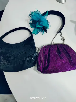 Conjunto de dos bolsos y un tocado artesanal, ideales para eventos. - Bolso negro con lentejuelas. - Bolso morado brillante. - Tocado con flor azul turquesa y detalles brillantes. NO HAGO ENVÍOS POR ONTIME NO SON FIABLES NI SEGUROS. PREFIERO INPOST QR. Pueden crear lotes a su gusto y ahorrar gastos de envío 😃.