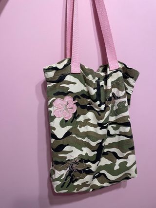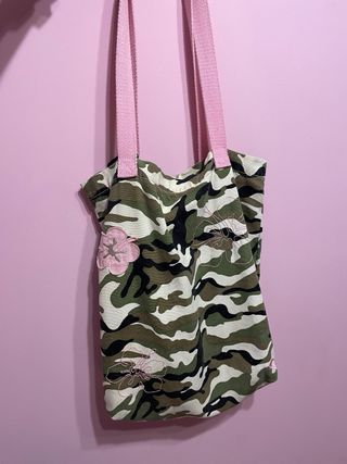 Bolso de tela con estampado de camuflaje y detalles de flores. - Diseño de camuflaje en tonos verdes y marrones. - Adornos de flores rosas aplicadas. - Asas de tela en color rosa.
