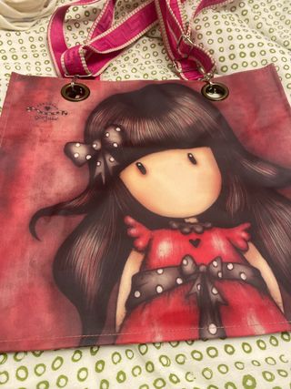 Bolso con un diseño encantador de Santoro's. - Estampado de la muñeca Gorjuss. - Tirantes de tela rosa con detalles. - Ojales metálicos para colgar los tirantes.