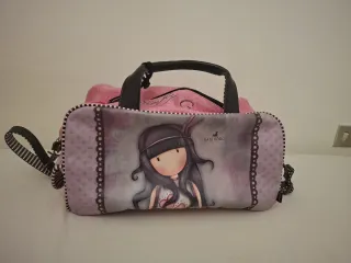 Práctica bolsa de viaje con el diseño de Gorjuss de Santoro. - Estampado frontal de la muñeca. - Asas de mano y correa para hombro. - Cierre de cremallera. Medidas: 25cm - 45cm - 25cm Tres bolsillos interiores y uno de ellos con cremallera y y un bolsillo lateral para guardar los acces Muy versátil. Se puede utilizar para viajar y para llevar la ropa de deporte Múltiples formas de llevarla. Muy poco uso, está como nueva, pero tiene pequeños desgastes en la asa, adjunto fotografía