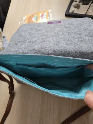Bolso de piel con un diseño moderno y funcional. - Material exterior de fieltro gris. - Forro interior de tela azul con estampado de puntos. - Bolsillo interior con cremallera.