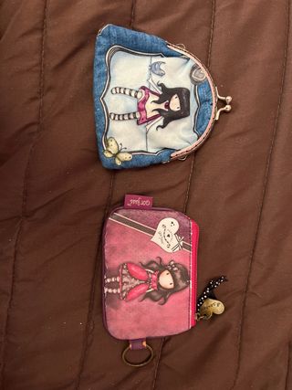 Dos monederos los dos a 9€ con el diseño característico de Gorjuss. - Un monedero azul con cierre de boquilla. - Un monedero morado con cremallera y llavero. - Ambos presentan ilustraciones de la muñeca Gorjuss.