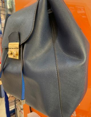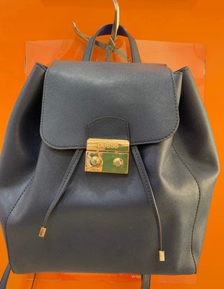 Mochila Guess muy práctica para viajar.Exterior de material sintético. Cierre con solapa y cordón ajustable. Piezas metálicas color dorado.Medidas 29 cm de altox 26 cm de ancho y 15 cm de profundidad.Bolsillo interior con logo de Guess con cremallera.Precio compra 120€.Poco uso.
