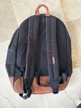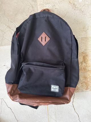 Mochila Herschel con un diseño clásico y funcional. Combina tela negra con detalles en cuero marrón. - Compartimento principal espacioso. - Bolsillo frontal con cremallera. - Base reforzada en cuero. - Etiqueta de la marca visible. Apenas usada pero la polipiel de la parte inferior se esta pelando. Lo que es el interior y la tela esta impecable.