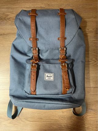 Mochila Herschel de color azul con un diseño clásico y funcional: - Compartimento para portatil. - Correas ajustables para mayor comodidad. - Bolsillo frontal con cierre Dimensiones: 28x 45x14cm Capacidad: 21 | La posibilidad de regular las asas: Si Las correas de la mochila estan algo desgastadas, como se aprecian en las totos. Todo lo demas esta en pertecto estado y no presenta descosidos. Entrenga en Barcelona o envío