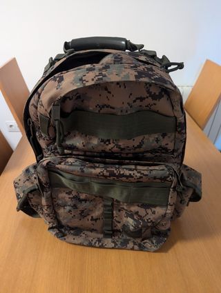 Mochila táctica MARPAT marca TAC Force. Varios bolsillos. Tiene compartimento para bolsa de hidratación. De unos 35/40 litros de capacidad. Medidas: 48cm alto x 25cm profundo x 30cm ancho (50cm contando bolsillos laterales inferiores)