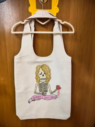 Bolso de tela con un diseño original de Cris LiberArte. Presenta un esqueleto con una rosa y el texto Amores Suicidas. - Diseño artístico único. - Material de tela resistente.