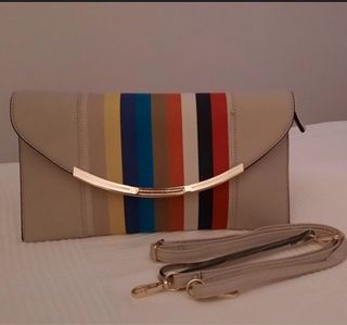 Elegante bolso con diseño de rayas verticales en varios colores. - Cierre con solapa. - Detalle metálico dorado en la parte frontal. - Incluye correa larga ajustable.
