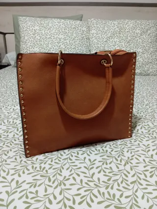 Bolso grande de color marrón con tachuelas doradas. Cierre con cremallera y asas cómodas para llevar. Amplio espacio interior. Medidas: Base 37x10 Alto 30
