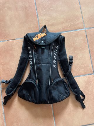 Mochila deportiva KTM con diseño Racing. - Color negro con detalles naranjas. - Logo KTM en la parte frontal. - Correas ajustables para los hombros. - Dos bolsillos frontales con cremallera.