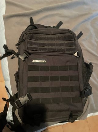 Mochila de estilo táctico con múltiples compartimentos y correas. - Diseño modular con sistema MOLLE. - Cierre de cremallera. - Asa superior. - Correas de hombro ajustables.