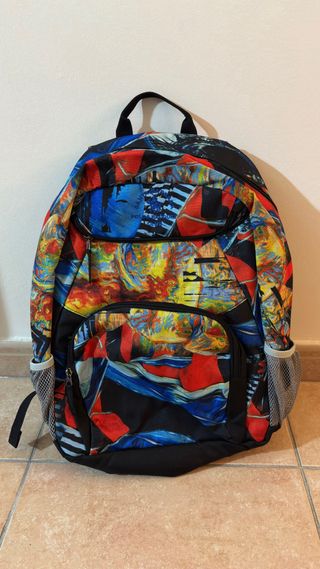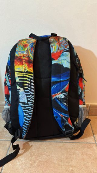 Mochila con un diseño vibrante y llamativo. - Compartimento principal espacioso. - Bolsillos frontales con cremallera. - Bolsillos laterales de malla. - Correas ajustables para los hombros. - Precio original: 50€. - Tamaño: 37x10x25 cm.
