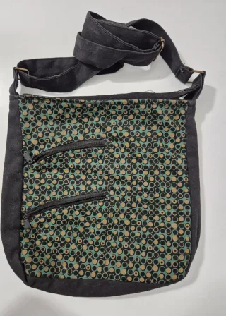 Bolso de hombro con un diseño llamativo y original. - Fabricado en 100% algodón. - Panel frontal con estampado de círculos. - Tres bolsillos exteriores con cremallera. - Correa ajustable para llevar al hombro.