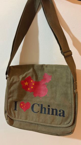 Bolso de hombro con un diseño único que muestra un mapa de China y la frase I love China. - Diseño con mapa de China en rojo y estrellas amarillas. - Frase I love China en negro. - Correas de hombro ajustables. - Tamaños: 25x6x29 cm, asa: 35 cm. Alargable. - Precio original: 30€.