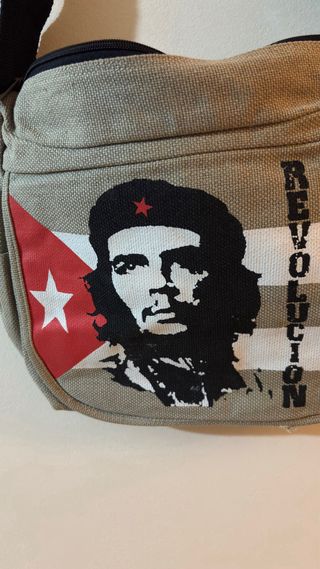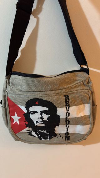 Bolso de hombro con diseño de Che Guevara y la bandera cubana. Ideal para llevar tus esenciales. - Estampado frontal icónico. - Cierre de cremallera. - Correa ajustable para mayor comodidad. - Compartimento lateral. - Precio original: 40€. - Tamaño: 30x25x7'5 cm, asa: 28 cm alargable.
