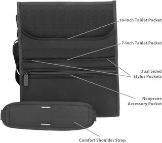 Práctica mochila bandolera para llevar tu tablet y accesorios. - Compartimento principal para tablet 10". - Compartimento secundario para tablet 7" o teléfono/e-reader. - Correa ajustable para el hombro. - Bolsillo frontal con cierre. - Varios compartimentos para accesorios.