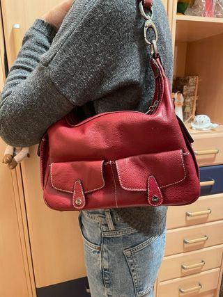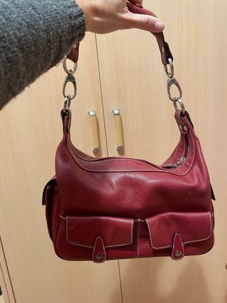 Bolso de hombro con un diseño elegante y práctico. Nuevo a estrenar. - Material: Piel texturizada. - Color: Rojo vibrante. - Cierre: Solapa con botón. - Bolsillos exteriores: Dos frontales con solapa. - Detalle: Costuras blancas contrastantes.