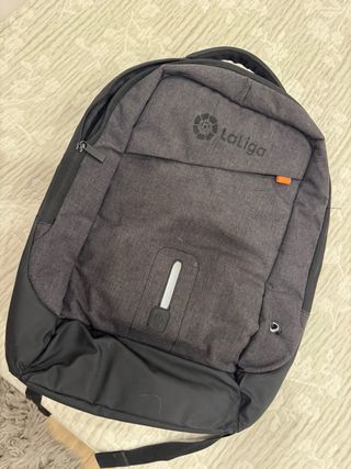 Mochila oficial de La Liga con un diseño moderno y funcional. - Color gris oscuro con detalles en negro. - Logo de La Liga visible en la parte frontal. - Compartimento principal con cierre de cremallera. - Bolsillo frontal adicional con cierre de cremallera. - Asa superior para colgar. - Correas de hombro ajustables.