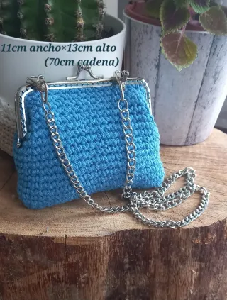 Monedero tejido a mano en crochet, con un diseño moderno y práctico. - Cierre de boquilla metálica. - Cadena plateada para llevar al hombro o cruzado. - Medidas aproximadas: 11cm ancho x 13cm alto. - Longitud de la cadena: 70cm.